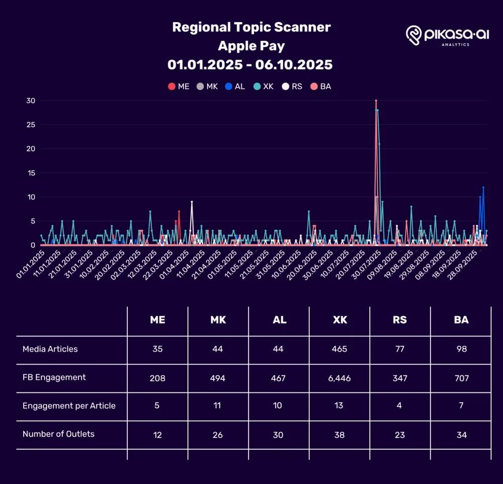 Analytics.live showed that the spike in Apple Pay conversation was driven by a handful of outlets. In Montenegro Investitor and Antena M published how‑to guides and bank announcements. North Macedonia’s Sloboden Pechat led with 211 social engagements, while Albania’s Gazeta Telegraf generated buzz by explaining that Apple Pay works for Mastercard holders. In Kosovo, Kallxo and Indeks online posts attracted hundreds of interactions, and Serbia’s tabloid Kurir dominated the discussion.