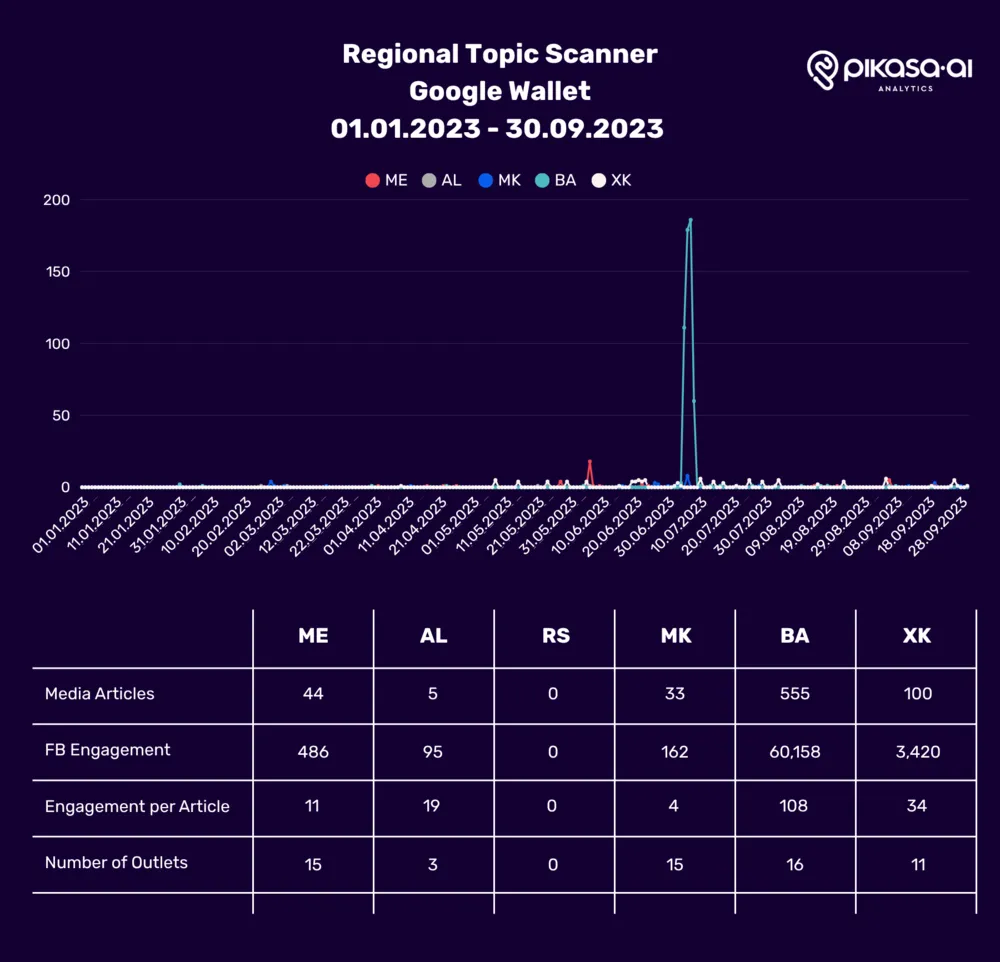 Comparing the two services using Analytics.Live we revealed a disconnect between availability and visibility. Apple Pay enjoyed an explosive media spike when Bosnia & Herzegovina and Kosovo announced their launches in July 2025. Hundreds of articles and social media posts appeared almost overnight; Kosovo alone generated more than 400 stories and thousands of reactions as local portals covered the news. In contrast, Google Wallet’s earlier rollouts drew muted coverage. During the first nine months of 2023 only 44 Montenegrin articles about the service were tracked, compared with 555 Bosnian articles about Apple Pay in 2025.