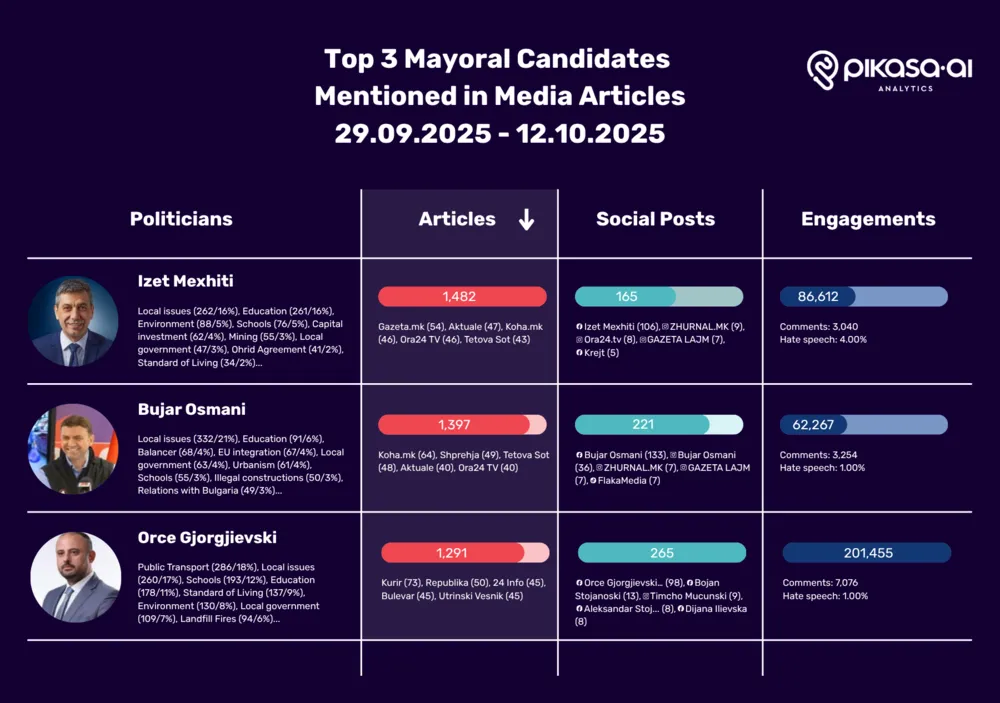 The table below summarises coverage and engagement for the three mayoral candidates who dominated online conversation. Figures reflect the 29 Sept - 12 Oct 2025 monitoring period. The chart shows how these candidates compare in terms of article volume. Izet Mexhiti and Bujar Osmani received the most coverage, reflecting their prominence in Albanian language media, while Orce Gjorgjievski dominated Macedonian language portals.