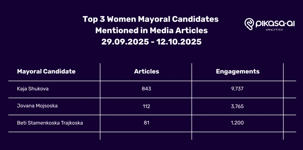 Only one woman, Kaja Shukova, appears among the top ten candidates by article count. She accrued 843 pieces and generated around 9737 engagements, respectable figures but still less coverage than her male counterparts. Media monitoring allows campaigns and watchdogs to quantify these disparities and advocate for balanced representation.