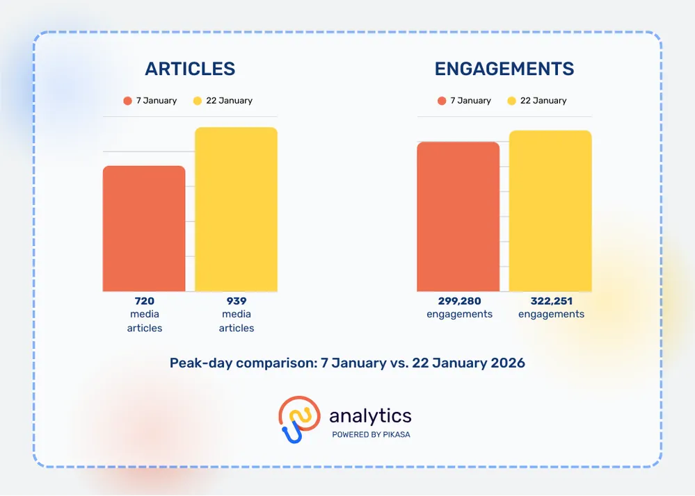 Without automated monitoring, coverage peaks like January 7 and January 22 would only be visible in hindsight, if at all. Analytics.live detected them as they happened, enabling communicators, analysts, and policy teams to respond while the conversation was still live.