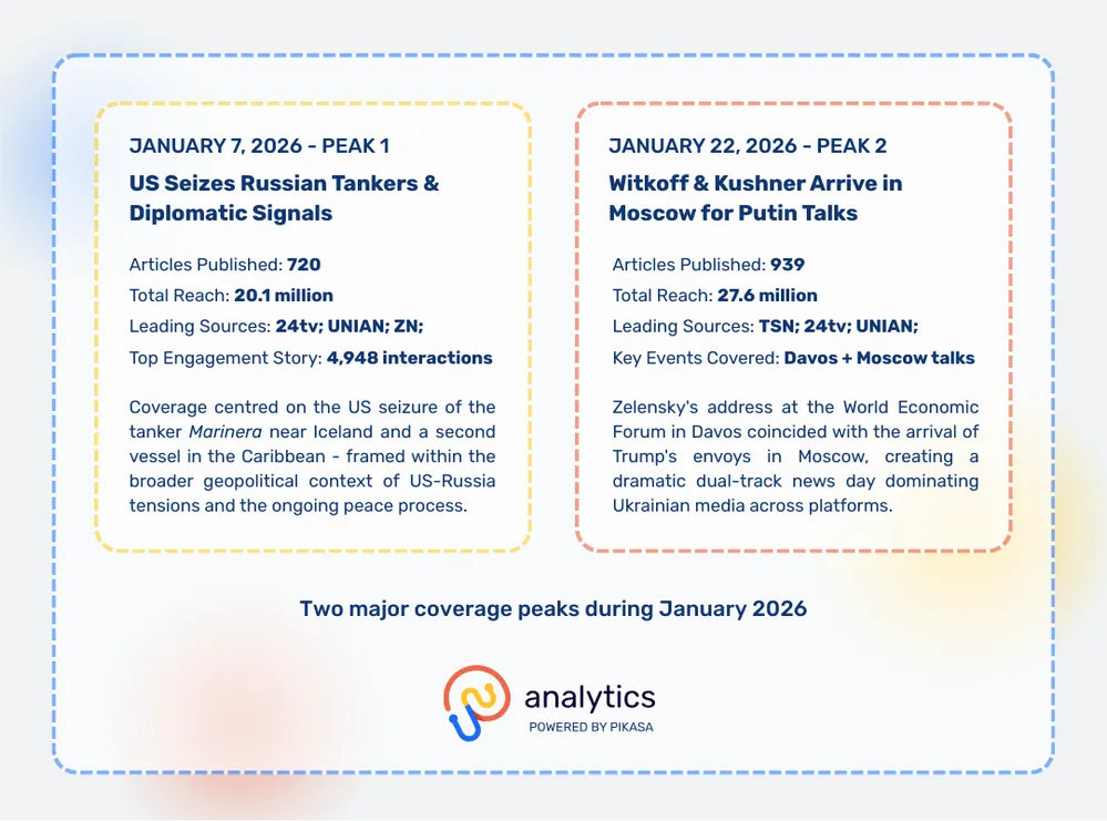 January 2026 peak coverage analysis highlighting two major Ukrainian media spikes driven by US–Russia negotiations and related geopolitical developments, based on Analytics.Live monitoring data.