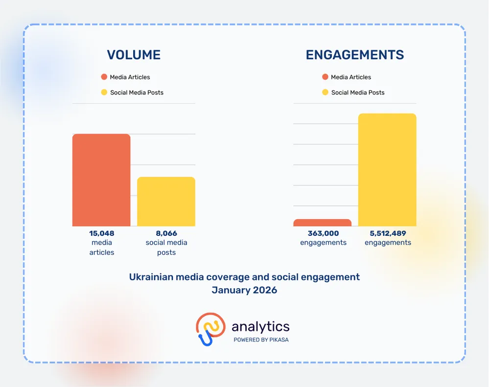 In January 2026, US-led peace negotiations became a dominant agenda-setting topic in Ukrainian online media, generating sustained, high-volume coverage across the national information space. Real-time monitoring by Pikasa platform analytics.live captured 15,048 articles published across 79 Ukrainian media outlets, generating over 363,000 reader engagements and reaching a broader audience via social media - with 5.5 million social engagements across 8,066 social posts