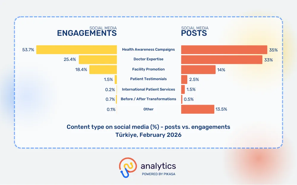 A smaller but strategically important share of hospital communication is directed toward international audiences. 12.6% of all social media posts are published in English, indicating a deliberate effort to reach patients beyond the domestic market. This content typically highlights treatments, medical expertise, and hospital facilities in a format that is accessible and relevant to international audiences. Through this bilingual approach, hospitals extend their visibility and position themselves within the global healthcare landscape, aligning with their broader objective of attracting medical tourism.