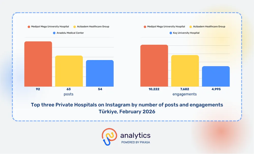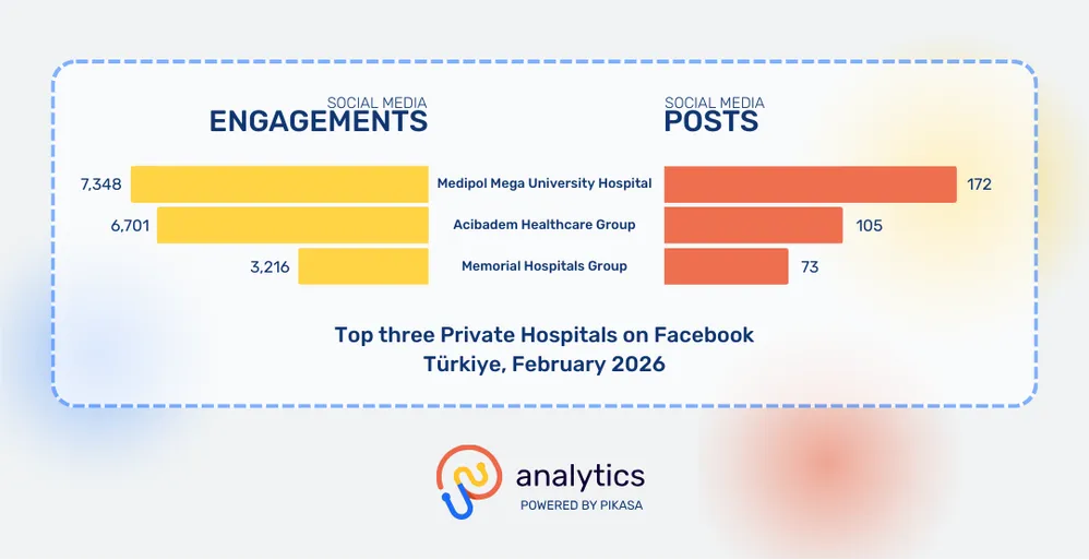 Facebook serves as the primary channel for information and continuity, accounting for 43% of all social media posts. Hospitals use it to share regular updates, health advice, doctor announcements, and institutional news, positioning the platform as a space for steady, informative communication. Among the most active hospitals on Facebook are Medipol Mega University Hospital, Acıbadem Healthcare Group, and Memorial Hospitals Group.